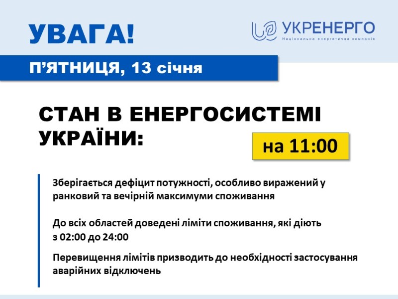 Станом на 11:00 13 січня споживання електроенергії знаходиться на рівні вчорашнього дня. Відповідно зберігається дефіцит потужності в енергосистемі, особливо виражений у ранковий та вечірній максимуми споживання. Водночас вже на вихідні очікується поступове потепління по всій Україні, внаслідок чого прогнозується зменшення споживання.