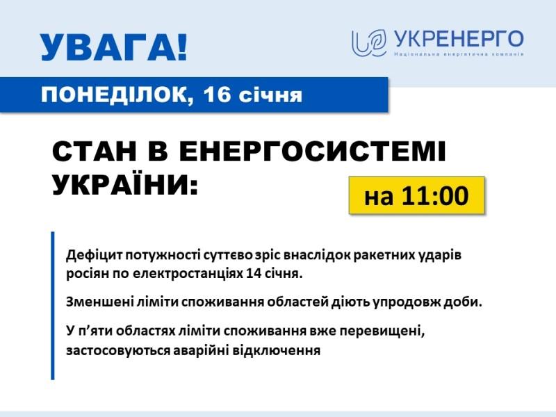 Станом на 11:00 триває відновлення енергосистеми після 12-го масованого ракетного удару ворога 14 січня.